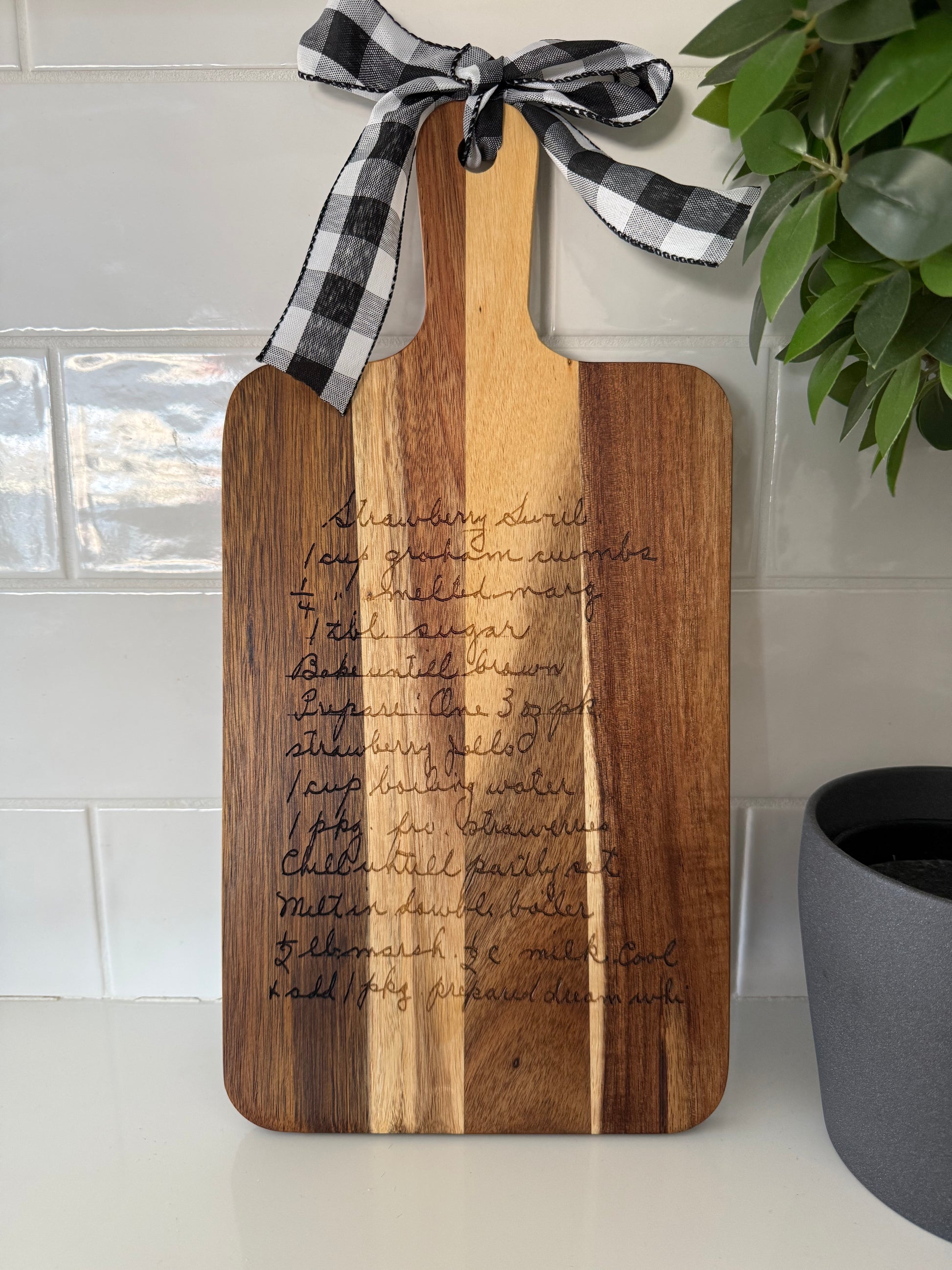 Acacia wood cutting board engraved with your special recipe. Simply snap a clear photo of the recipe, email it to us (spazlaserworks@gmail.com) and we will do the rest! A proof will also be sent for approval before engraving.